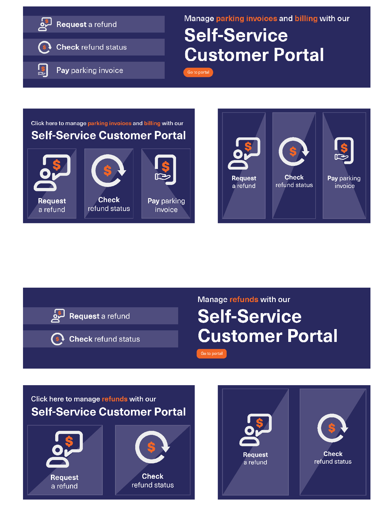 A series of user-friendly buttons was created for the DFW Airport website to simplify navigation for parking invoice management, billing, and refunds. The designs align with the airport’s branding and ensure easy access to the Self-Service Customer Portal for managing payments and refunds.